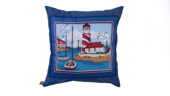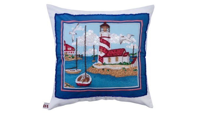 Jean or White cotton decorative pillow (45×45) with cotton applique, hand-beaded with acrylic colorful beads. Ideal for decoration for a living room, a sitting room or a playroom in a beach house.