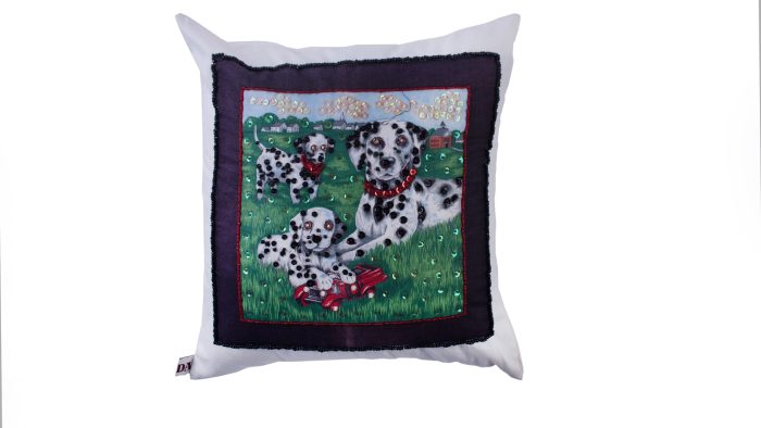 Άσπρο βαμβακερό διακοσμητικό μαξιλάρι (45×45) με βαμβακερό απλικέ, κεντημένο στο χέρι με ακρυλικές πολύχρωμες χάντρες. Ιδανικό να δώσει μια πολύχρωμη νότα φρεσκάδας και πολυτέλειας σε ένα καθιστικό ή σε ένα παιδικό δωμάτιο ή σε ένα δωμάτιο παιχνιδιού.
