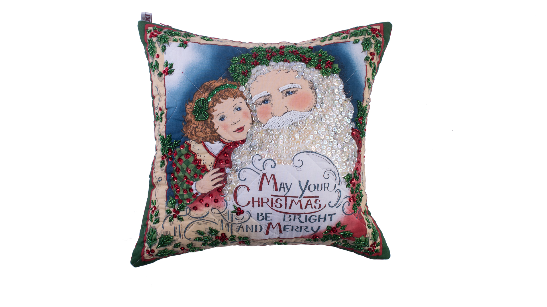 Εμπριμέ διακοσμητικό μαξιλάρι (45×45), κεντημένο στο χέρι με ακρυλικές πολύχρωμες χάντρες. Ιδανικό να δώσει μια πολύχρωμη νότα φρεσκάδας και πολυτέλειας στην χριστουγεννιάτικη διακόσμηση του σπιτιού σας.