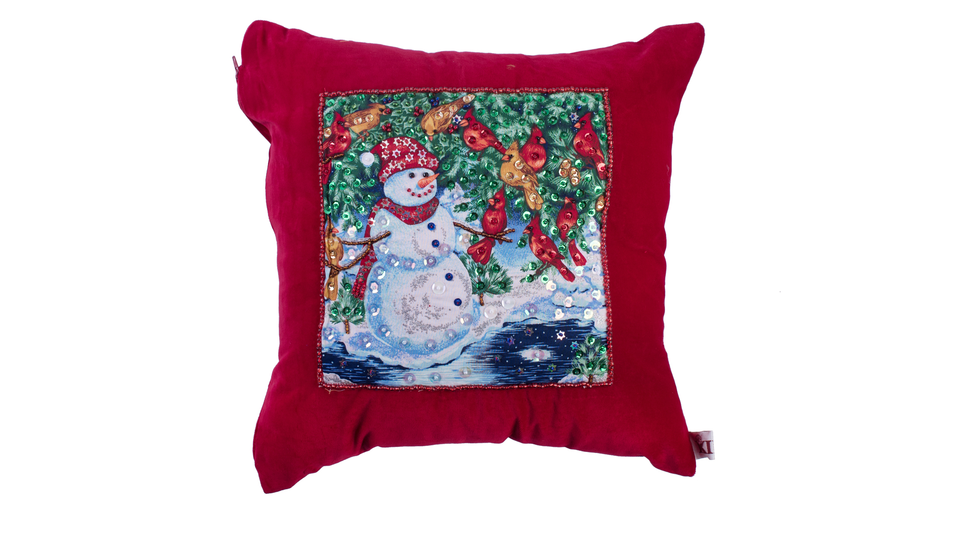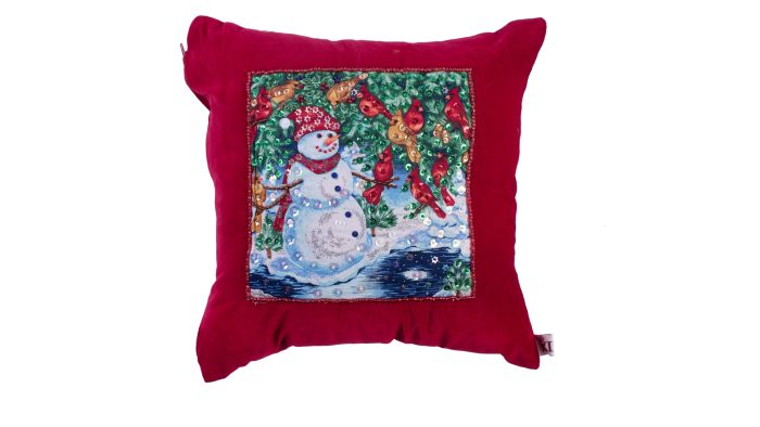 Κόκκινο βελούδινο διακοσμητικό μαξιλάρι (45×45) με βαμβακερό απλικέ, κεντημένο στο χέρι με ακρυλικές πολύχρωμες χάντρες. Ιδανικό να δώσει μια πολύχρωμη νότα φρεσκάδας και πολυτέλειας στην χριστουγεννιάτικη διακόσμηση του σπιτιού σας.