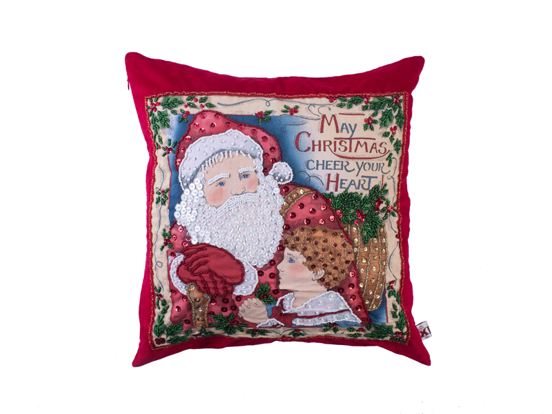 Κόκκινο βελούδινο διακοσμητικό μαξιλάρι (45×45) με βαμβακερό απλικέ, κεντημένο στο